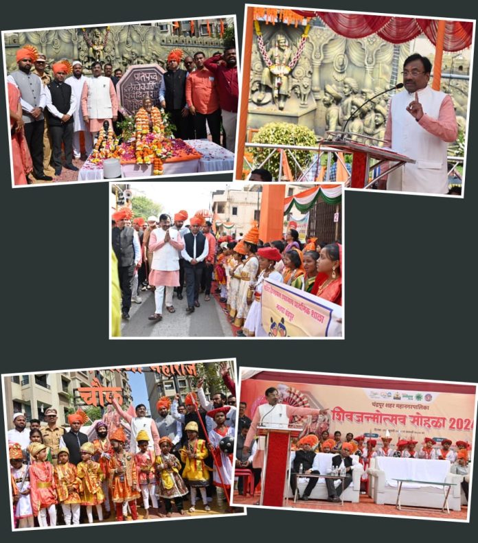 *माँ जिजाऊ व छत्रपतींची वेशभुषा ठरली आकर्षण*: शिवजयंतीचे औचित्य साधून चंद्रपूर महानगर पालिकेच्या वतीने माँ जिजाऊ व छत्रपतींची वेशभुषा स्पर्धा आयोजित करण्यात आली होती. यात माँ जिजाऊ आणि बाल शिवाजीच्या वेशभुषेत असलेली शालेय मुले गिरनार चौकापासून गांधी चौकापर्यंत रस्त्याच्या बाजुला उभी राहून ‘जय भवानी, जय शिवाजी’ असा जल्लोष करीत होती. त्यांच्या गर्जनेने सर्व परिसर दुमदुमला. यावेळी पालकमंत्री सुधीर मुनगंटीवार यांनी बालकांचे विशेष कौतुक केले. तसेच उत्कृष्ट आयोजनासाठी जिल्हा प्रशासनाचेही अभिनंदन केले.