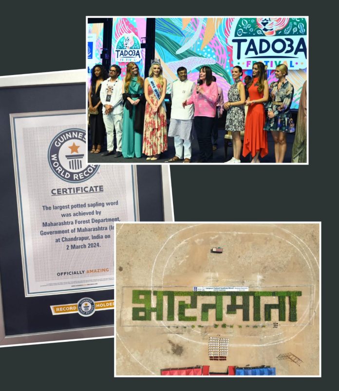 चंद्रपूर येथे वनविभागाच्या वतीने 1 ते 3 मार्च या कालावधीत ‘ताडोबा महोत्सव 2024’ आयोजन करण्यात आले आहे. या महोत्सवांतर्गत वेगवेगळ्या प्रजातींच्या रोपट्यांपासून ‘भारतमाता’ हा शब्द लिहून वर्ल्ड रेकॉर्ड करण्याचा संकल्प वनमंत्री सुधीर मुनगंटीवार यांनी केला होता. हा संकल्प आज (शनिवारी) चंद्रपुरातील रामबाग येथे प्रत्यक्षात साकारण्यात आला. 26 प्रजातींच्या तब्बल 65724 रोपट्यांनी ‘भारतमाता’ या शब्दाची निर्मिती केली आणि गिनेस बुक ऑफ वर्ल्ड रेकॉर्डचे प्रमाणपत्र प्राप्त केले.