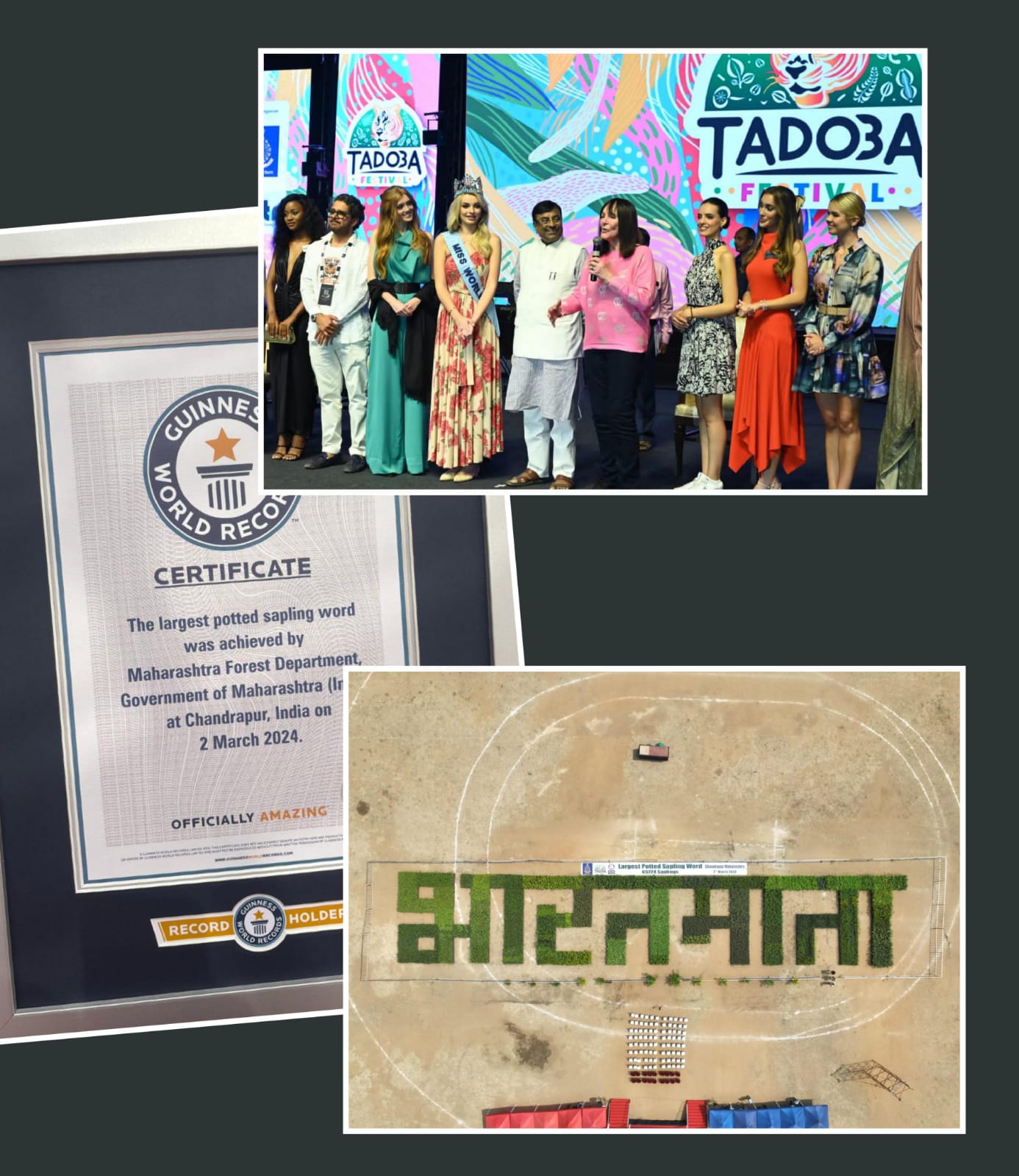 यावेळी बोलताना वनमंत्री सुधीर मुनगंटीवार म्हणाले, ‘आतापर्यंत वन विभागाने चार लिमका रेकॉर्ड केले. आता मात्र प्रथमच राज्याच्या वनविभागाने गिनेस बुक ऑफ वर्ड रेकॉर्ड केला आहे. यासाठी वनविभागाच्या वरिष्ठ अधिकाऱ्यांसह सर्व वन अधिकारी, वन कर्मचारी अभिनंदनास पात्र आहेत. चंद्रपुरात 65724 रोपट्यांनी लिहिलेल्या ‘ग्रीन भारतमातेचा’ संकल्प संपूर्ण जगभरात पोहचला असून ही आमच्यासाठी केवळ एक फोटो फ्रेम नसून प्रयत्नांची पराकाष्ठा करण्याचा महामार्ग आहे.’