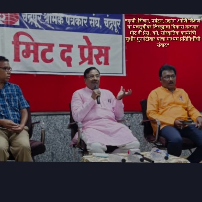 चंद्रपूर :- जिल्ह्याच्या विकासाला आपले प्रथम प्राधान्य आहे. कृषी, सिंचन, पर्यटन, उद्योग आणि शिक्षण या पंचसूत्रीवर जिल्ह्याचा विकास केला जाणार आहे. त्यामुळे पुढील काही वर्षांत या क्षेत्रात मोठ्या प्रमाणात विकास आणि रोजगार उपलब्ध झालेला दिसेल असा विश्वास राज्याचे वने, सांस्कृतिक कार्य व मत्स्यव्यवसाय विकासमंत्री सुधीर मुनगंटीवार यांनी व्यक्त केला. चंद्रपूर श्रमिक पत्रकार संघाच्या वतीने सोमवारी ‘मीट दी प्रेस’चे आयोजन करण्यात आले होते. यावेळी त्यांनी स्थानिक माध्यम प्रतिनिधींशी जिल्ह्याच्या विकासाच्या अजेंड्यावर संवाद साधला.