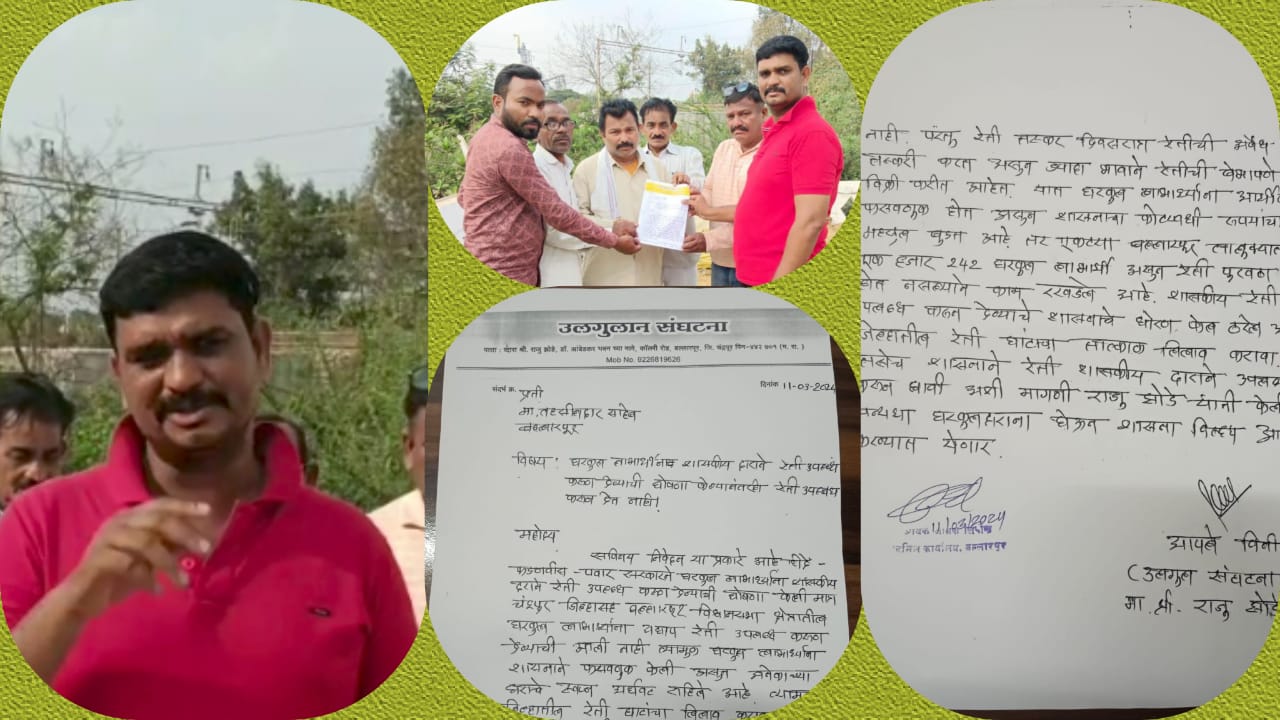 शिंदे-फडणवीस-पवार सरकारने घरकुल लाभार्थ्यांना शासकीय दराने रेती उपलब्ध करून देण्याची घोषणा केली होती.मात्र चंद्रपुर जिल्ह्यासह बल्लारपूर विधानसभा क्षेत्रातील घरकुल लाभार्थ्यांना अद्याप रेती उपलब्ध करून देण्यात आली नाही.त्यामुळं घरकुल लाभार्थ्यांची शासनाने फसवणूक केली असून अनेकांच्या घराचे स्वप्न अर्धवट राहिले आहे.त्यामुळं जिल्ह्यातील रेती घाटांचा लिलाव करावा किंवा लाभार्थ्यांना रेती स्वस्त दरात उपलब्ध करून द्यावी अशी मागणी उलगुलान संघटनेचे अध्यक्ष राजू झोडे यांनी केली आहे.
