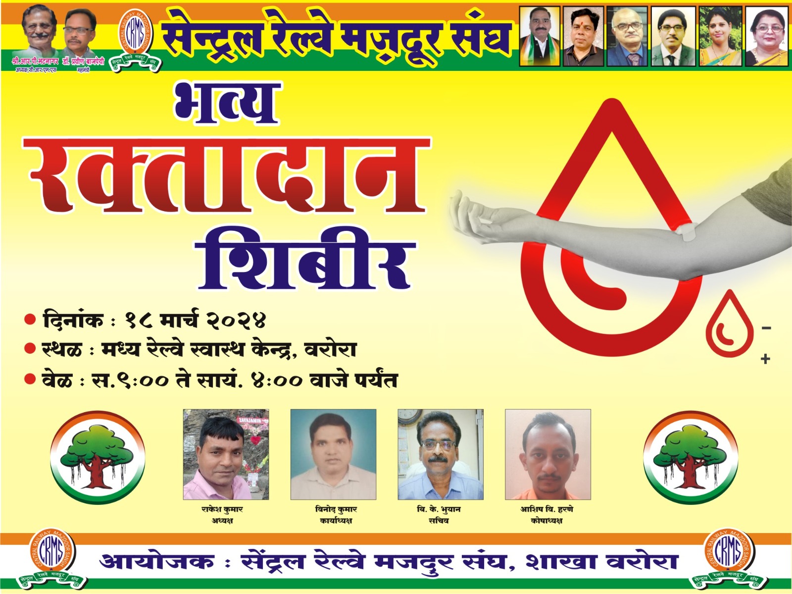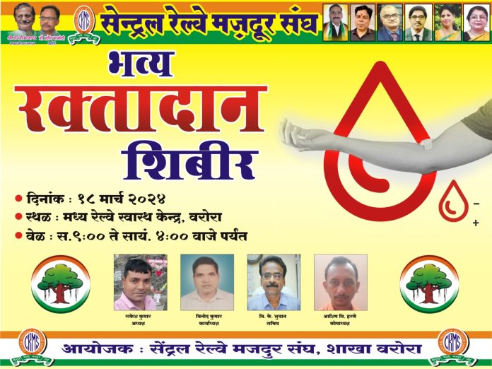 सेंट्रल रेल्वे मजदूर संघ शाखा वरोरा यांच्या वतीने सोमवार, दिनांक १८ मार्च २०२४ रोजी वरोरा रेल्वे हॉस्पिटल येथे रक्तदान शिबिराचे आयोजन करण्यात आले आहे. संघाच्या वतीने अध्यक्ष राकेश कुमार यांनी सांगितले की, ‘रक्तदान, महादान ‘ आहे. रक्ताच्या कमतरतेमुळे कुणाचाही जीव जाणार नाही, या उद्देशाने वरोरा येथे रक्तदान शिबिराचे आयोजन करण्यात आले आहे. रक्तदान शिबिराचे उद्घाटन सकाळी ९.०० वाजता होणार असून शिबिर सकाळी ९.०० ते दुपारी ४.०० वाजेपर्यंत सुरू राहणार आहे. स्वेच्छेने रक्तदान करण्यासाठी इच्छुकांनी संघाशी संपर्क साधावा. शिबिराच्या यशस्वितेसाठी जास्तीत जास्त नागरिकांनी रक्तदान करावे, असे आवाहन सेंट्रल रेल्वे मजदूर संघ शाखा वरोरा अध्यक्ष राकेश कुमार, कार्याध्यक्ष विनोद कुमार, सचिव बी.के. भुयान, कोषाध्यक्ष आशिष हरणे आदींनी केले आहे.