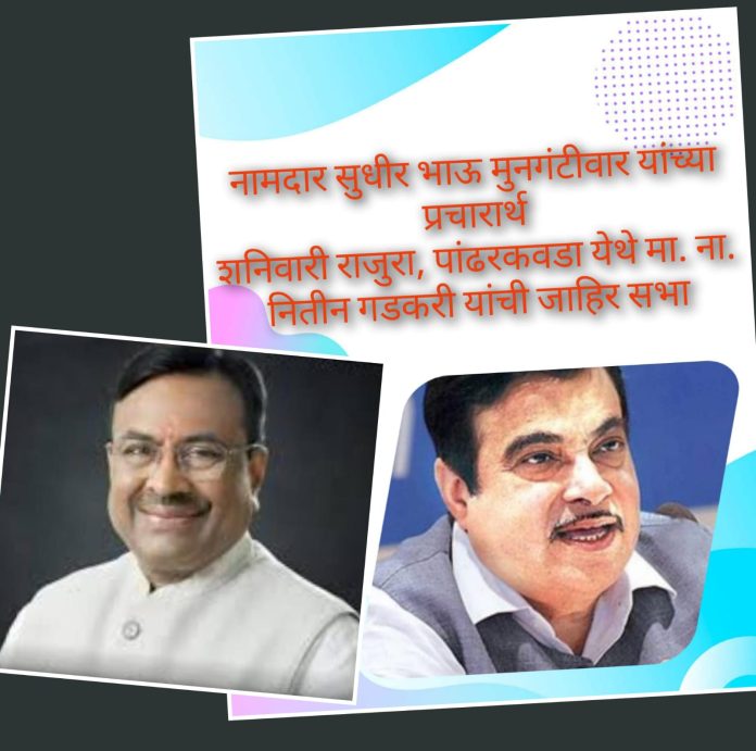 *चंद्रपूर, ता. ०४ : चंद्रपूर-वणी-आर्णी लोकसभा मतदार संघाचे भाजपा, राष्ट्रवादी काँग्रेस शिवसेना आणि मित्रपक्ष महायुतीचे अधिकृत उमेदवार मा. श्री. सुधीर मुनगंटीवार यांच्या प्रचारार्थ शनिवारी ०६ एप्रिल २०२४ रोजी राजुरा येथे सकाळी १०.०० वाजता व पांढकवडा (जि. यवतमाळ) येथे दुपारी १.०० वाजता केंद्रीय मंत्री मा. श्री. नितीन गडकरी यांची जाहीर सभा आयोजित करण्यात आलेली आहे.*