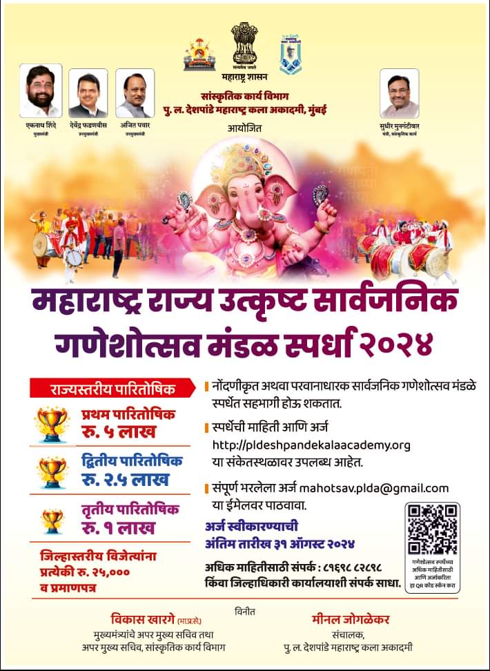 सदर स्पर्धेत, धर्मादाय आयुक्त यांच्याकडे नोंदणी केलेल्या किंवा स्थानिक पोलिसांकडे किंवा स्थानिक स्वराज्य संस्था यांची परवानगी घेतलेल्या सार्वजनिक गणेशोत्सव मंडळांना सहभागी होता येईल. महाराष्ट्र शासनाच्या www.maharashtra.gov.in संकेतस्थळावरील पर्यटन व सांस्कृतिक कार्य विभागाच्या दि. 31 जुलै 2024 च्या शासन निर्णयात स्पर्धा निवडीचे निकष, अर्ज उपलब्ध करून देण्यात आले आहे. सदर अर्जाच्या नमुन्यानुसार स्पर्धेत सहभागी होऊ इच्छिणाऱ्या सार्वजनिक गणेशोत्सव मंडळांनी पु.ल. देशपांडे महाराष्ट्र कला अकादमी, मुंबई याच्या Mahotsav.plda@gmail.com या ईमेलवर दिनांक 1 ते 31 ऑगस्ट 2024 या कालावधीत अर्ज सादर करावा. सदर स्पर्धेत जास्तीत जास्त सार्वजनिक गणेशोत्सव मंडळांनी सहभाग घ्यावा, असे आवाहन सांस्कृतिक कार्य मंत्री सुधीर मुनगंटीवार यांनी केले आहे.