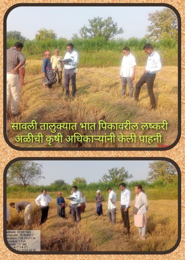 सावली तालुक्यातील भात पिकावर लष्करी अळीचे प्रादुर्भाव झाल्याबाबत वृत्तपत्रात प्रकाशित केले होते. त्याचीच दाखल घेत कृषि विभागाचे अधिकारी व कृषि विज्ञान केंद्राचे शास्त्रज्ञ यांनी भात पिकावर लष्करी अळीचा परदुर्भाव झालेल्या क्षेत्राची पाहणी केली.