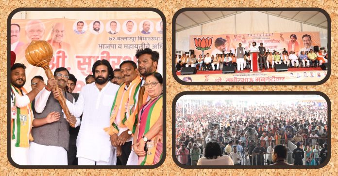 बल्लारपूर विधानसभा मतदारसंघाचे भाजप-महायुतीचे अधिकृत उमेदवार ना. श्री. सुधीर मुनगंटीवार यांच्या प्रचारार्थ डब्ल्यूसीएल कॉलनी मैदानावर श्री. पवन कल्याण यांच्या जाहीर सभेचे आयोजन करण्यात आले. या सभेला हजारोंच्या संख्येने लोकांची उपस्थिती होती. पवन कल्याण यांचे भाषण सुरू असताना प्रत्येक वाक्यावर टाळ्यांचा कडकडाट सुरू होता. त्यामुळे बल्लारपूरकरांनी अभूतपूर्व अश्या सभेचा अनुभव घेतला.