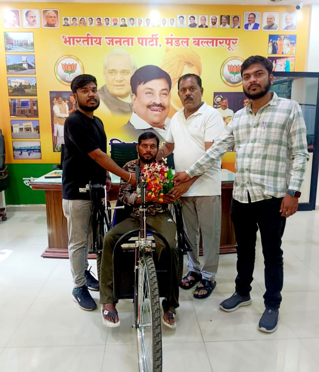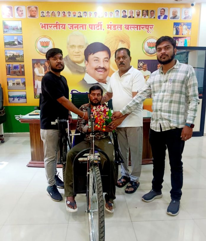 उन्होंने हमारे सहयोगी भारतीय जनता पार्टी के उपाध्यक्ष राजेश उर्फ राजू दासरवार जी से संपर्क किया उसी निमित्य आदरणीय श्रीमान सुधीर भाऊ मुनगंटीवार जी के माध्यम से तीन चक्की साइकिल दिया गया
