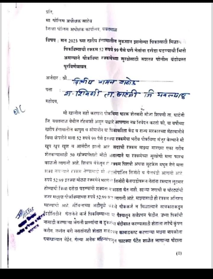 पिक विम्याची रक्कम घरी नेण्यासाठी शसस्त्र  पोलीस सुरक्षा देण्याबाबत पोलीस अधीक्षकांना शेतकऱ्याची विनंती!